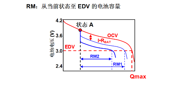 下面介紹的是電池的剩余容量。剩余容量是指當(dāng)前狀態(tài)放到EDV的電池容量,EDV也就是終止放電電壓。圖中當(dāng)前狀態(tài)A在一個給定的電流下進行放電,放電到3.0V的時候,對應(yīng)的剩余容量從圖中標(biāo)出的就是R1。那如果在狀態(tài)A的情況下,同比較大的電流放電,這個時候這個曲線的位置會比開路電壓更低一點,也會比剛才的小電流放電的RM1對應(yīng)的位置更低一點,那這個時候得到的剩余容量是RM2。RM2和RM1對應(yīng)的放電曲線它們的區(qū)別在于使用的放電電流是不一樣的,放電電流越大,曲線的位置越低,剩余容量就越小,所以電池的剩余容量是與放電速率有關(guān)的,不同的電流下面電池的剩余容量是不一樣的。有的用戶在電池的實際使用過程中在放電的情況下,會發(fā)現(xiàn)電池的容量由少變多,他感到不可理解,實際這里可以解釋一下,這種情況是由于放電電流的變化造成的,當(dāng)我們看到電池容量由少變多的情況,這個通常是由于放電電流突然變小造成的,因為在不同的電流下電池可以放出的容量是不一樣的,當(dāng)放電電流變小的時候,它可以放出的容量是可以增加的。