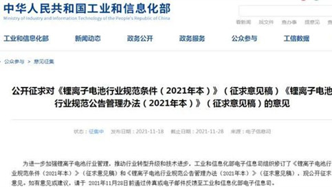 工業(yè)和信息化部11月18日信息顯示,為進(jìn)一步加強(qiáng)鋰離子電池行業(yè)管理,推動(dòng)行業(yè)轉(zhuǎn)型升級(jí)和技術(shù)進(jìn)步,工業(yè)和信息化部(電子信息司)組織修訂了《鋰離子電池行業(yè)規(guī)范條件(2021年本)》(征求意見(jiàn)稿)和《鋰離子電池行業(yè)規(guī)范公告管理辦法(2021年本)》(征求意見(jiàn)稿),現(xiàn)公開(kāi)征求意見(jiàn)。其中,《鋰離子電池行業(yè)規(guī)范條件(2021年本)》(征求意見(jiàn)稿)提出,引導(dǎo)企業(yè)減少單純擴(kuò)大產(chǎn)能的制造項(xiàng)目,加強(qiáng)技術(shù)創(chuàng)新、提高產(chǎn)品質(zhì)量、降低生產(chǎn)成本。 -