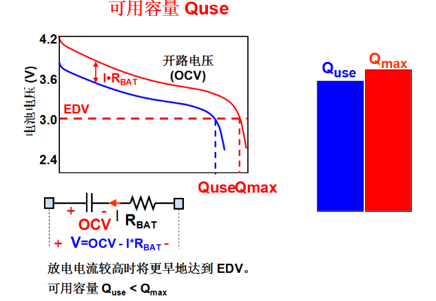 鋰電池的容量中還有一個對應(yīng)的容量就是可用容量,可用容量實際上也許只用了80-90%!因為剛才講的是電池的化學(xué)容量,鋰電池的化學(xué)容量是在電流很小的時候測得的容量,它更多的是由電池本身的特性決定的。那實際在電池的使用過程中,這么多容量不是都能夠放得出來的,在實際的使用過程中,由于有一定的放電電流,所以放電曲線會比開路電壓曲線低,大家可以看到這條曲線,由于存在電池的內(nèi)阻,實際的放電曲線是藍色的這條曲線,由藍色的曲線和紅色的曲線對應(yīng)的值得到Quse,Quse實際指的是電池的可用容量,在這張曲線中我們發(fā)現(xiàn),由于電池內(nèi)阻的存在使這個曲線的位置往下移了,那么放電的時候會更早的達到放電終止電壓,也就是更早的達到EDV,所以Quse一般是小于Qmax。